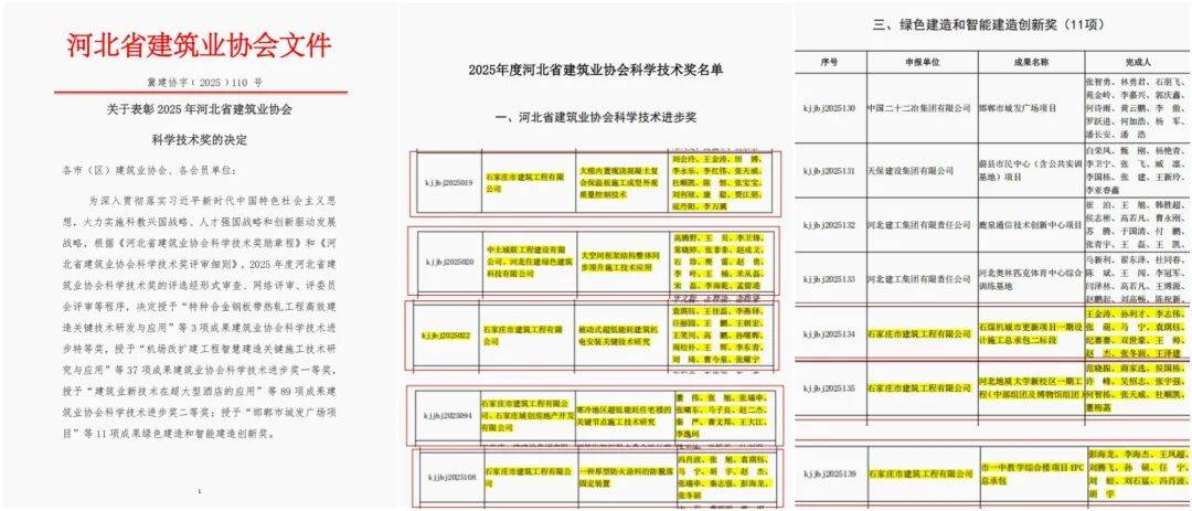 石建公司7项成果多点突破,以“绿色+智能”双轮驱动,成为行业标杆,展现出极强的技术创新性与实践价值。其中,公司凭借科技成果《大模内置现浇混凝土复合保温板施工成型外观质量控制技术》和《被动式超低能耗建筑机电安装关键技术研究》获得2项河北省建筑业协会科学技术进步奖一等奖;凭借科技成果《寒冷地区超低能耗住宅楼的关键节点施工技术研究》和《一种厚型防火涂料的防脱落固定装置》获得2项河北省建筑业协会科学技术进步奖二等奖;凭借科技成果《石煤机城市更新项目一期设计施工总承包二标段》《河北地质大学新校区一期工程(中部组团及博物馆组团)》及《市一中教学综合楼项目EPC总承包》获得3项绿色建造和智能建造创新奖,成为本次评选中获奖数量最多、覆盖领域最广的企业之一。