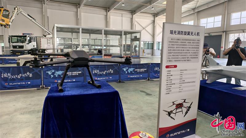 这是威海广泰空港设备股份有限公司制造的瑶光消防旋翼无人机。无人机采用独特极简风格设计,具备可拆卸机身结构,小收纳体积、大载重、挂载灵活等特点,可满足不同的应用场景需求。威海广泰空港设备股份有限公司是全球空港地面装备领军企业,国内先进的消防救援、移动医疗、无人机、电力电子装备制造商,出口全球100多个国家和地区,主导产品国内市场占有率60%。12种装备世界首创,29种装备填补了行业空白,先后完成C919大型客机首架机总装下线、首飞等重大活动保障任务。(中国网记者 秦金月 摄)