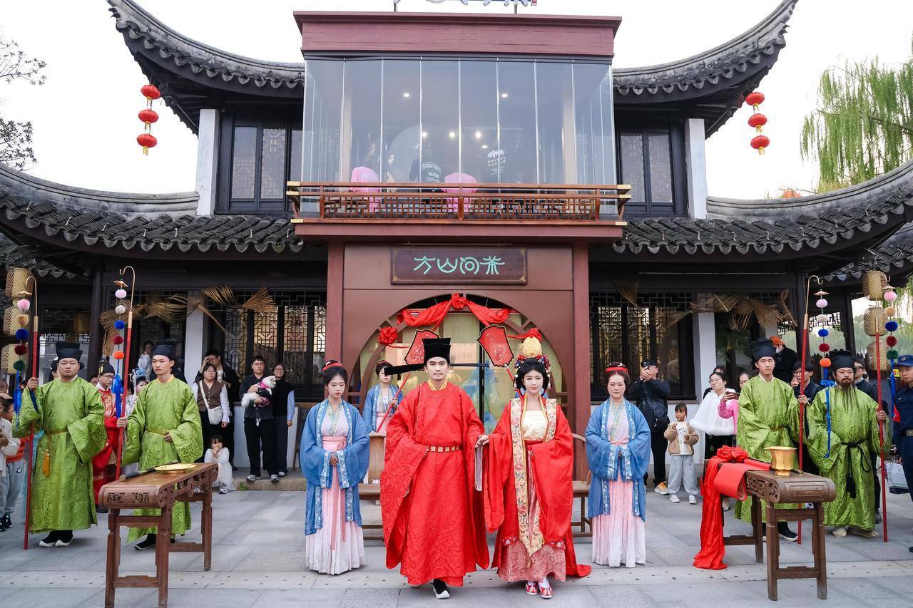 西塘“汉服+”体验,也向沉浸式、全链条方向进一步升级。本届西塘汉服文化周的水乡婚礼活动中,来自中国台湾的新人邱堂晟与文欢,在“方山问茶”举行了一场宋制婚礼。“我们为新人特制了宋词风格的婚书,还原了却扇、照镜等传统婚礼习俗。”工作人员表示。此外,11月起,西塘婚姻登记点也在景区正式挂牌。以后,新人们不仅能在古镇打卡水乡婚礼,还能带着汉服妆造直接领证,仪式感拉满。