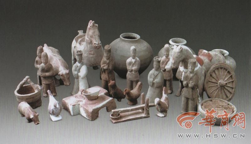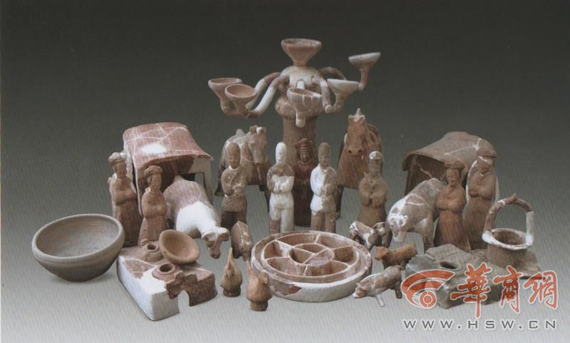 6座墓葬除M19为斜坡墓道单室带侧室墓外,其余5座皆为斜坡墓道双室或双室带侧室墓。出土器物可分为陶俑(男、女立俑)、陶动物(鞍马、猪、狗、鸡)、模型明器(牛车、灶、井、碓)、陶器(罐、瓶、碟、钵、甑),以及人骨周围的金属器类。以陶俑、陶牛车、陶鞍马、连枝灯、陶槅、陶帐座最具特色,是关中地区西晋十六国墓葬的典型器物。